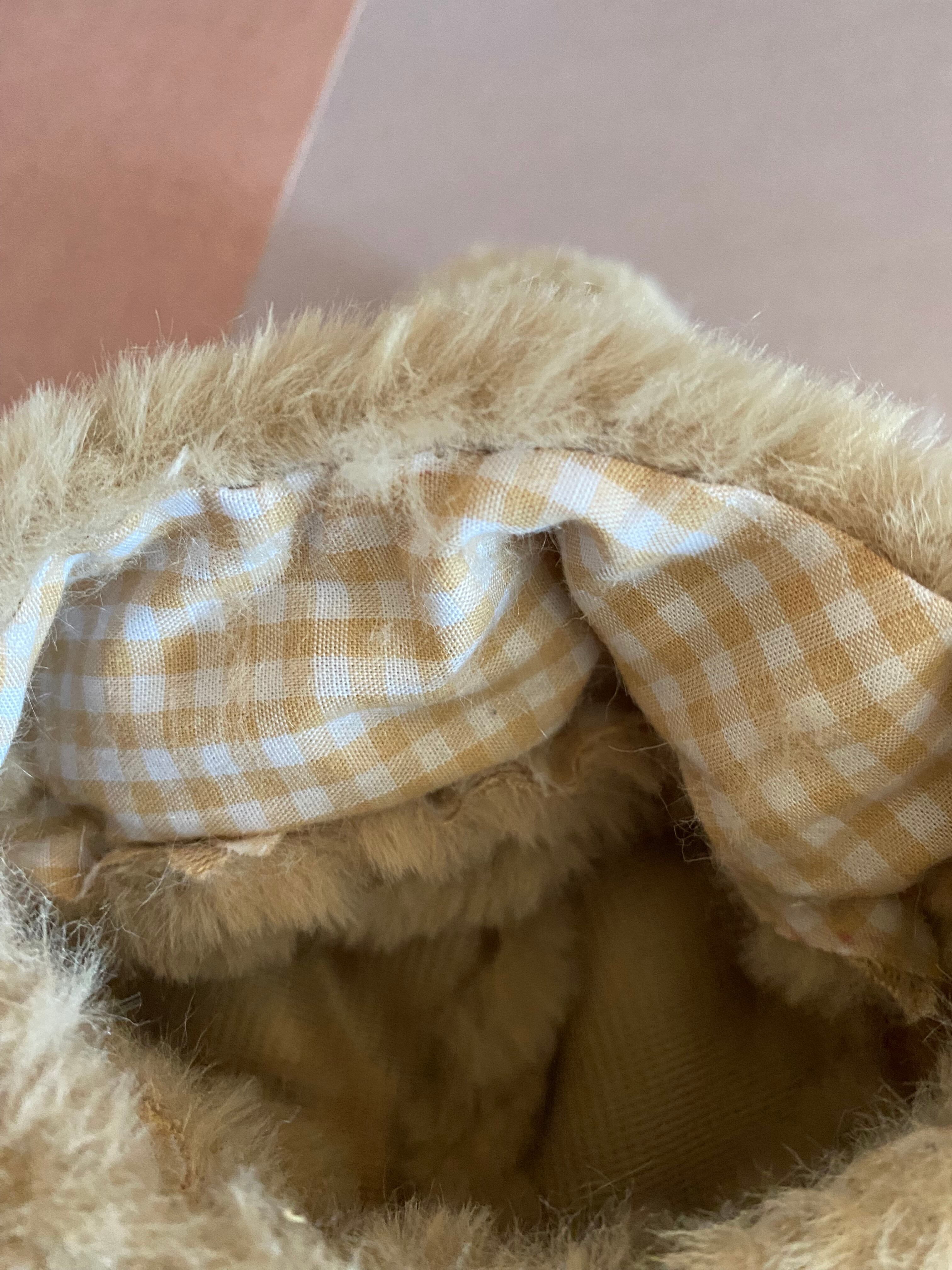 シンプルながらも、もふもふともこもこ感で可愛さを強調させたいという気持ちを込めて、ファー生地の着ぐるみを製作致しました。内側はカラーに合わせたギンガムチェック柄の布を使用しております。